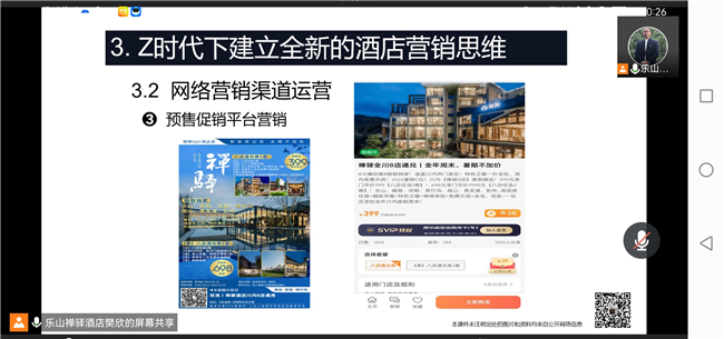 本网讯(文、图/王瑛)5月24日晚,由pg娱乐电子游戏官网入口主办的《旅游消费者行为》课程实践周专家讲座在行知楼517教室顺利举行。酒店管理专业负责人王瑛教授主持讲座,乐山师范学院pg娱乐电子游戏官网入口外聘专家、乐山禅驿酒店总经理樊欣主讲,主题是《Z时代下酒店营销思维变革》。学院院长助理孙永兴博士、酒店管理专业系主任秦容副教授和2019级旅游管理6班全体同学、2019级酒店管理专业部分同学在线参加了讲座。