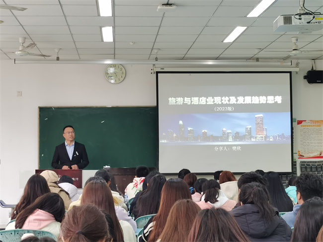 本次讲座的主题是“旅游与酒店业现状及发展趋势思考”。樊欣用生动有趣的照片、视频和大量数据给同学们做了一场精彩的讲座,讲述了他对旅游与酒店业的认知、当下旅游与酒店业现状、未来旅游与酒店业发展趋势思考,介绍了禅驿酒店品牌的“网红”之路,热情邀请同学们有空去禅驿酒店打卡。樊欣鼓励同学们珍惜在校时光,夯实专业基础,找准自身定位,早作职业规划,能够跨界,会玩会创新,为成功在旅游与酒店行业就业打下基础。
