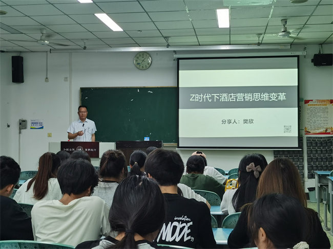 本网讯(文、图/王瑛)5月30日晚,pg娱乐电子游戏官网入口邀请学院外聘专家、四川禅驿集团品牌文化总监、乐山禅驿酒店总经理,学校93级优秀校友樊欣在行知楼213教室为2023级旅游管理专业全体同学以《Z时代下酒店营销思维变革》为题开展讲座。