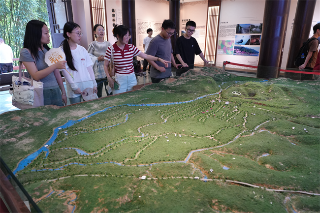 行程的最后,同学们抵达水文化陈列馆,万利平老师带领同学们参观学习了东风堰的历史沿革、灌区工程体系以及工程的管理和文化。展厅对我国被列入世界灌溉工程遗产的其他水利工程进行了介绍。此外,展厅还展示了夹江的造纸、年画以及重要的农副产品,让同学们对夹江有了更全面的认识,促进学生思考东风堰在旅游目的地管理中的独特优势与潜在挑战,探讨如何将文化资源与旅游产品开发相结合,形成有吸引力和竞争力的旅游品牌形象。