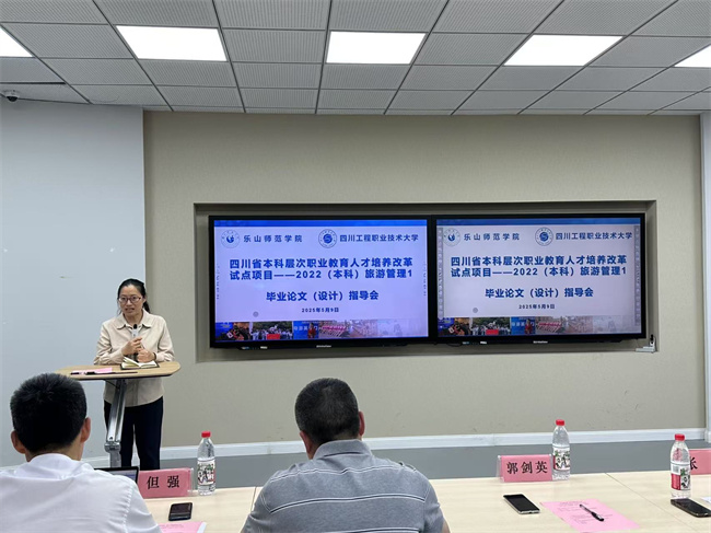 本网讯(图、文/孙永兴)5月9日,乐山师范学院、四川工程职业技术大学四川省本科层次职业教育人才培养改革试点项目——2022级(本科)旅游管理1班毕业论文指导会在四川工程职业技术大学举行。会议由四川工程职业技术大学旅游管理学院副院长朱洪端主持,四川工程职业技术大学旅游管理学院党总支书记余立勤、院长张伟、毕业论文指导教师代表、2022级(本科)旅游管理1班全体同学参加了会议。pg娱乐电子游戏官网入口党委副书记、院长郭剑英,副院长但强、副院长孙永兴和教学科研科科长张力参加了指导会。