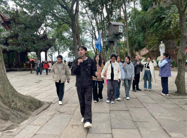 在任课教师的带领下,学生们前期围绕乐山大佛历史文化、建筑特色、佛教艺术及保护现状等内容进行了系统调研与讲解设计。景区现场,同学们分组展开实地导游讲解,从景区导览、历史沿革到文化细节解读,完整模拟了真实带团流程。他们用生动的语言、专业的表述和自信的仪态,向游客与师生展示了扎实的知识储备和良好的服务意识,引来不少游客驻足聆听。