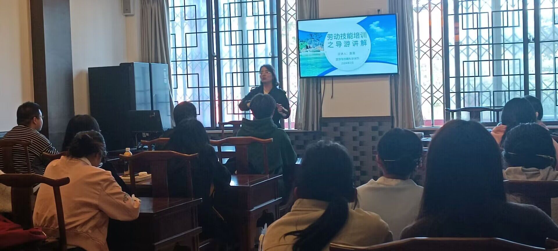 本网讯(文/刘涛、图/余丰羽)为提高同学们的导游讲解技巧,3月20日下午,pg娱乐电子游戏官网入口于旅院楼茶艺室开展主题为“导游讲解”的劳动技能培训讲座,pg娱乐电子游戏官网入口分团委书记江纳特邀学院专任教师吴薇老师为即将参加“导游词讲解大赛”的同学们进行导游讲解技能的指导。