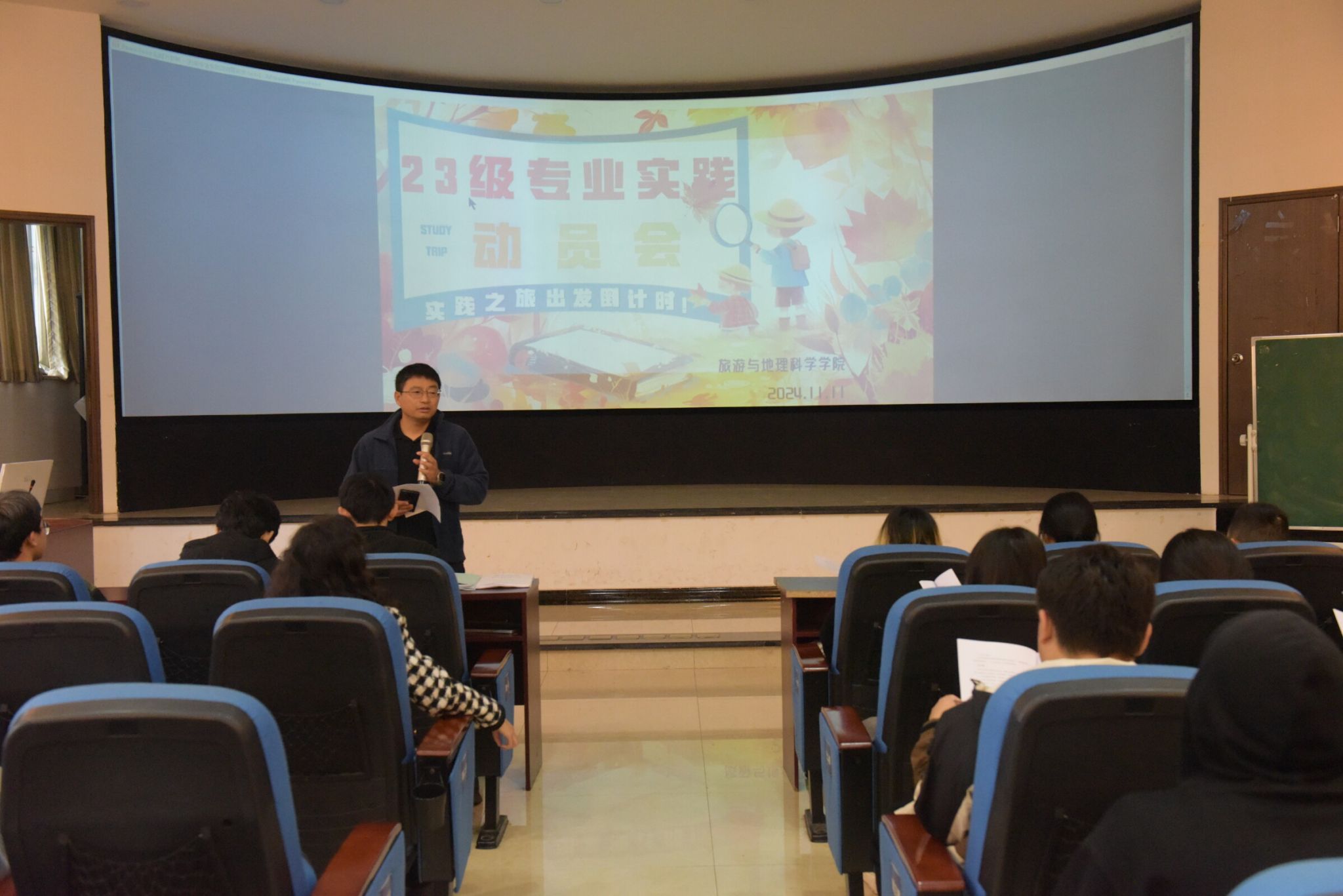 本网讯(文/杨洋、图/卿婷)11月11日,pg娱乐电子游戏官网入口在旅院楼3D教室召开了专业实践动员会。学院党委副书记、院长郭剑英,带队老师,2023级旅游管理、人文地理与城乡规划、酒店管理三个专业的学生参加了会议。会议由学院副院长孙永兴主持。