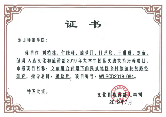 大学生团队实践项目面向本科及高职院校旅游相关专业学生,遴选资助150个项目团队,支持开展旅游业实践和志愿服务活动,每个团队资助1万元。项目开展以来,各地对人才培养项目的申报十分踊跃,共有来自全国各院校上千个大学生团队申报实践扶持培养项目,pg娱乐冯晓兵老师指导、2017级旅游管理1班刘柏林同学担任负责人的《文旅融合背景下的民族地区乡村旅游扶贫路径研究》项目成功入选。这也是pg娱乐学生继2017年入选国家旅游局“万名旅游英才计划”后再次入选,充分体现了pg娱乐在旅游专业人才培养的显著成果。