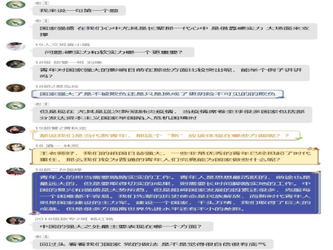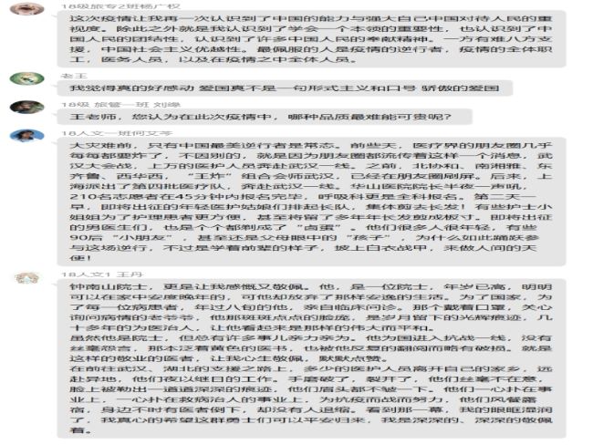 在这之前,旅游学院分团委已经召开了分团委线上开班典礼和第一次理论课学习,本次线上主题讨论课,要求所有学员们主要围绕“新冠肺炎疫情发生后国内外时局变化和各国政府采取的举措”提出看法和进行讨论,共有五轮提问和探讨环节。课程进行期间,同学们踊跃发言,纷纷结合话题发表自己的看法。其中,大部分同学谈到了党中央关于疫情防控的及时科学部署、谈到了大国担当和武汉封城的“壮士断腕”精神、谈到了国内外在防疫过程中的对比区别,并提出了自己的看法与疑问,针对学员们各类型的提问,王一鸣逐个进行详细的文字和语音答复,同时他表示爱国不是一句形式主义的口号,在国内疫情尚未解封、国外疫情持续蔓延背景下,高校学子更应紧密团结在党中央周围,努力相应国家号召,为最终打赢全国疫情防控战尽到自己的社会责任。