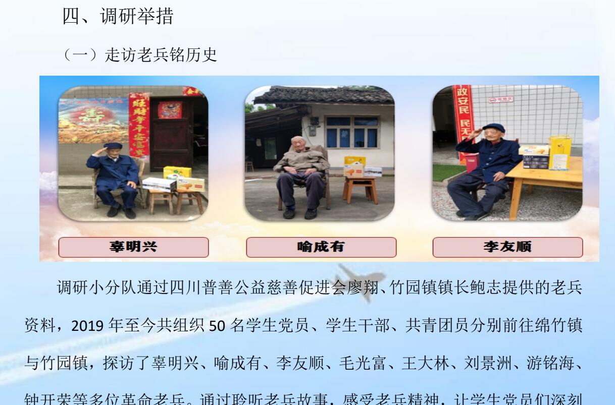 旅游学院“探访老兵铭历史·红色文化塑技能”系列活动主要选择四川省乐山市辖区内曾参与过抗美援朝、抗日战争、解放战争等革命活动的仍健在的老兵作为探访对象,现已探访辜明兴、喻成有、李友顺、毛光富、王大林、刘景洲、游铭海、钟开荣等多位革命老兵,足迹遍布乐山辖区各地。在探访过程中,通过实地走访、与老兵面对面、老兵座谈会、慰问老兵、参观烈士陵园、重温入党誓词等活动,来收集各位老兵的抗战事迹、革命历史、红色精神等各种关于老兵的第一手资料,挖掘那些不为人知往事和战争时期历史点滴,铭记老一辈革命家的丰功伟绩、传承红色基因,发扬红色传统。并以“探访老兵”活动作为切入点,在学校各二级教学院、旅游学院各班级相继开展“红色故事同分享”、“红色微党课”、“红色讲坛”等各类活动,分享老兵故事,传承红色文化。让广大学子意识到:新中国的建立是无数革命先烈用鲜血和生命铸就的,红色政权是来之不易的,新中国也是来之不易的,中国特色社会主义更是来之不易,以此传承老兵精神、革命精神、红色精神,红色基因,提高青年大学生的思想觉悟和爱国觉悟。