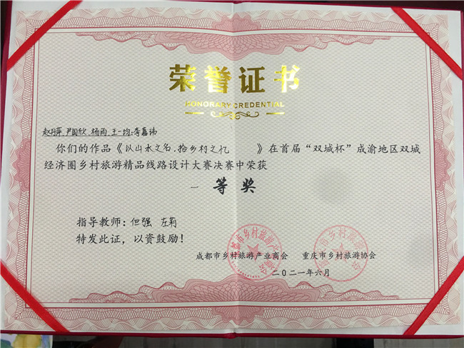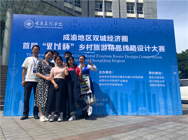 本网讯(文/左莉、图/赵丹萍)为了践行国家乡村振兴战略和中共中央政治局审议通过的《成渝地区双城经济圈建设规划纲要》精神,6月5日,由成渝地区双城经济圈乡村振兴学院联盟、成都市乡村旅游产业商会和重庆市乡村旅游协会主办,重庆文理学院、四川师范大学以及成都文理学院共同承办的首届“双城杯”乡村旅游精品线路设计大赛总决赛在重庆文理学院举行。比赛一共有来自重庆、四川、江苏、云南、陕西等省市100多件作品参赛,共有23支队伍入围了大赛决赛。pg娱乐旅游学院推送的《以山水之名,拾乡村之忆》项目入围决赛,并荣获一等奖,学校获得了“优秀组织奖”的殊荣。