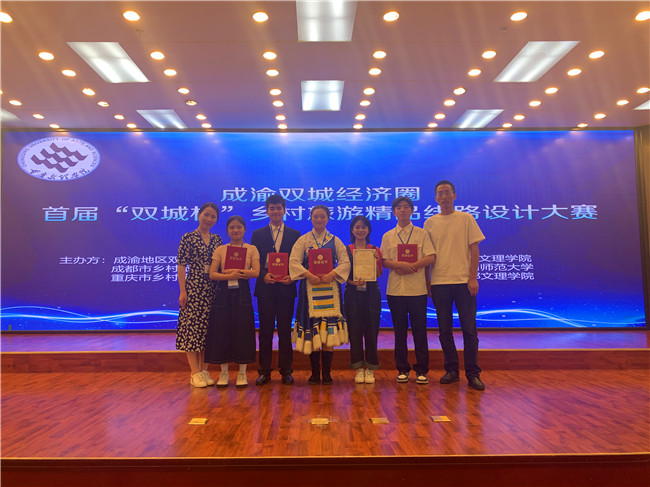 本次大赛以“巴山蜀水美丽川渝”为主题,旨在广泛调动高校、文旅企业、乡村从业者等部门和人员的积极性,通过创新设计乡村旅游线路,形成更加丰富、更具特色的乡村旅游产品体系,培育成渝地区双城经济圈乡村旅游新业态,提升乡村旅游产业竞争力,助力乡村振兴,促进川渝两地的共融与发展。《以山水之名,拾乡村之忆》——成乐雅甘6日游精品线路由旅院学子赵丹萍、尹国欣、杨雨、王一均和李嘉玮同学共同设计,学院但强老师和左莉老师共同指导。此线路打破常规线路设计,在前期充分调研的基础上,同学们结合学科专业知识,创新性地设计出一条践行绿色发展理念,绕山水环游,并融入少数民族文化、红色文化、三雅文化的乡村之旅,增强游客的美食、采茶、扎染、陶艺等体验感,让游客重拾乡村之忆,感受田园生活。比赛现场共分为现场展示和答辩两个环节,同学们以清晰而精彩的线路讲解、沉着而机敏的现场答辩获得了评委老师的一致好评。