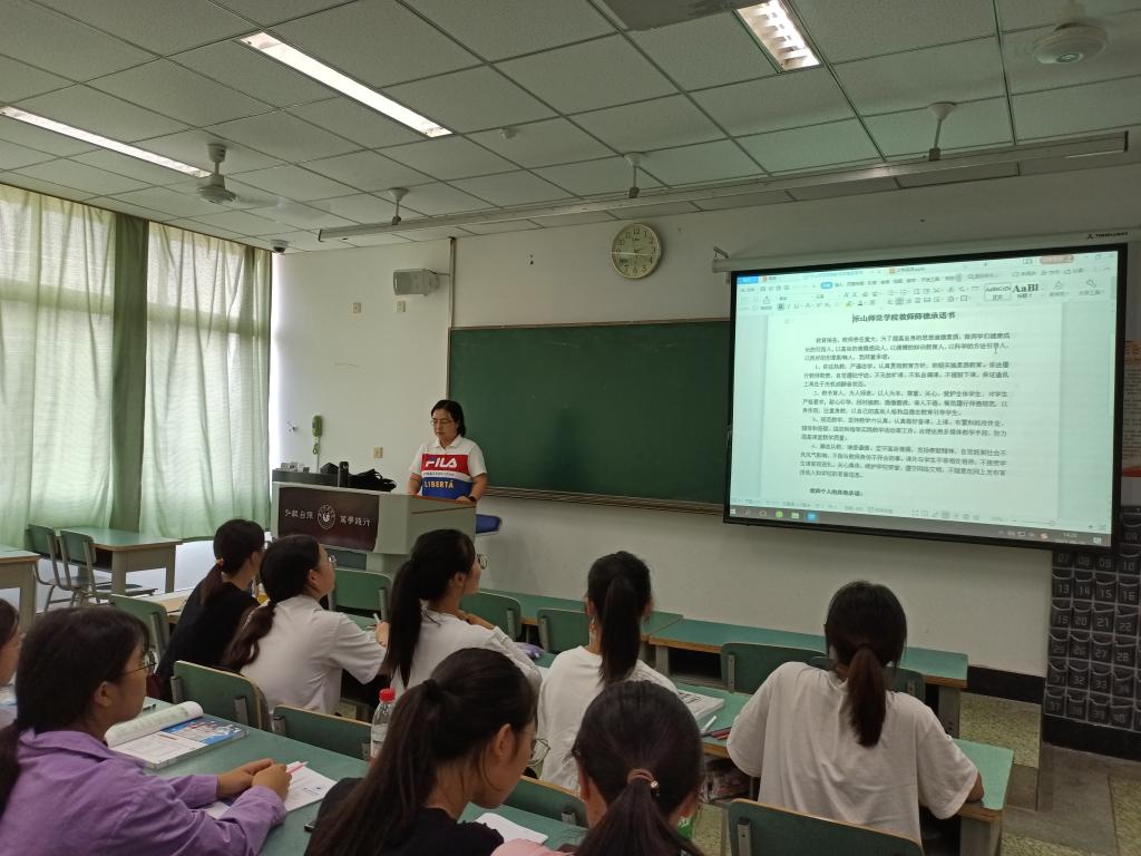 在本次活动中,同学们面对老师做出了自己的学德承诺:尊敬师长、勤奋求知、诚信学业、全面发展,做一名合格大学生和祖国建设的栋梁之才、为乐山师院和旅游学院争光添彩。而老师也做出了自己相应的师德承诺,希望自己可以和同学们一起树立新的目标,共同合作,一起进步,并最终各有收获。在承诺活动结束之后,就开始了正常的教学,新学期就此开始。窗外景色不断变换,驶过的站台不断增加,车轮依旧滚滚,学习之旅继续出发。