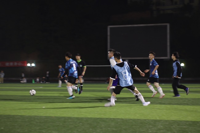 裁判一声哨响,两支球队展开了激烈的角逐。球员们个个精神饱满、奋力拼搏,就算摔倒也不叫苦,毫不犹豫站起来继续投入比赛,争先恐后来回传球。场下观众同样激情满满,挥舞院旗大喊“青春旅游,力争上游”,给场上队员鼓舞士气。最终,旅游学院和马克思主义学院队以4:0的比分赢得本场比赛。