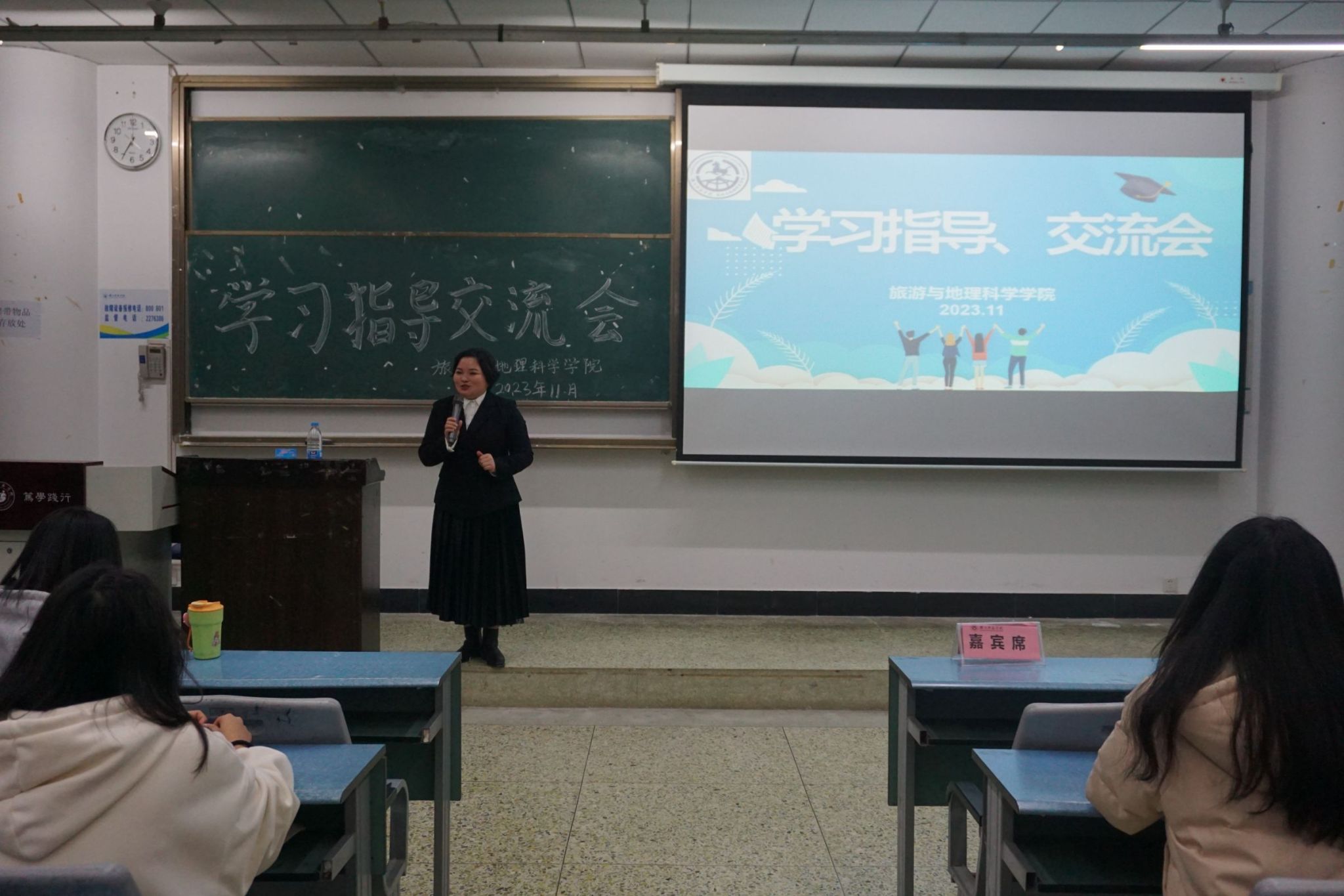 21级旅游管理二班吉宜洋以要制定明确的学习计划、要了解所学学科的性质、保持健康这三点鼓励大家在期末复习过程中要把握方向,坚持不懈。21级人文地理与城乡规划一班李慧结合人文地理与城乡规划专业的特点分享了诸多期末实用小技巧,建议大家在期末复习中要学会自主学习、合理安排和劳逸结合。21级酒店管理一班李莲莲从日常学习和期末复习两方面建议大家要有个人的短期和长期规划,正确把握“人机距离”。22级地理科学二班马丹妮通过对综合测评成绩的详细介绍鼓励大家要有信心面对即将到来的期末考试。最后,李慧回答了大家对复习周的疑惑,并代表四位学姐向学弟学妹们表达美好祝愿。
