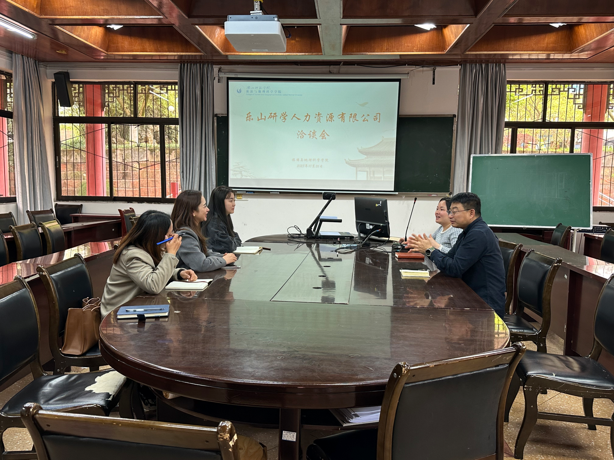 本网讯(图/文 侯怡旭)近日,旅游与地理科学院邀请四川省乐山市研学人力资源有限公司到学院实验楼102教室开展了实习就业洽谈。学院副院长孙永兴、2020级辅导员江纳以及该公司总经理张婉贞等一行四人参加了此次洽谈会。
