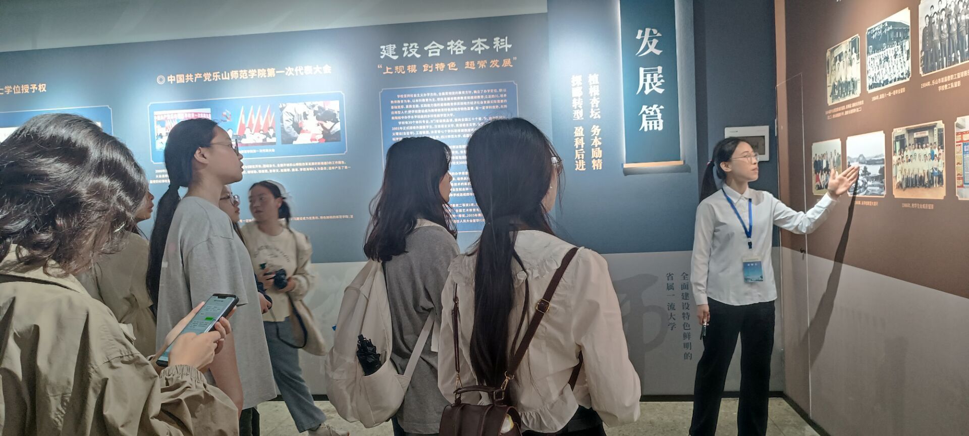 同学们先从前校门开始参观校园,感受乐师校园的独特魅力。大家从弘毅楼出发,参观武大纪念碑,了解了国立武汉大学西迁乐山艰苦办学八年的历史。接着,同学们来到校史馆。校史馆讲解员从乐山师范学院的办学历程、荣誉成就、优秀校友等方面介绍了学校的概况,让同学们深刻体会到了学校“弘毅自强、笃学践行”的校训。随后,大家来到pg娱乐电子游戏官网入口,参观旅游规划实验室、茶艺实验室等,并了解了四川旅游发展研究中心近几年所取得的研究成果。