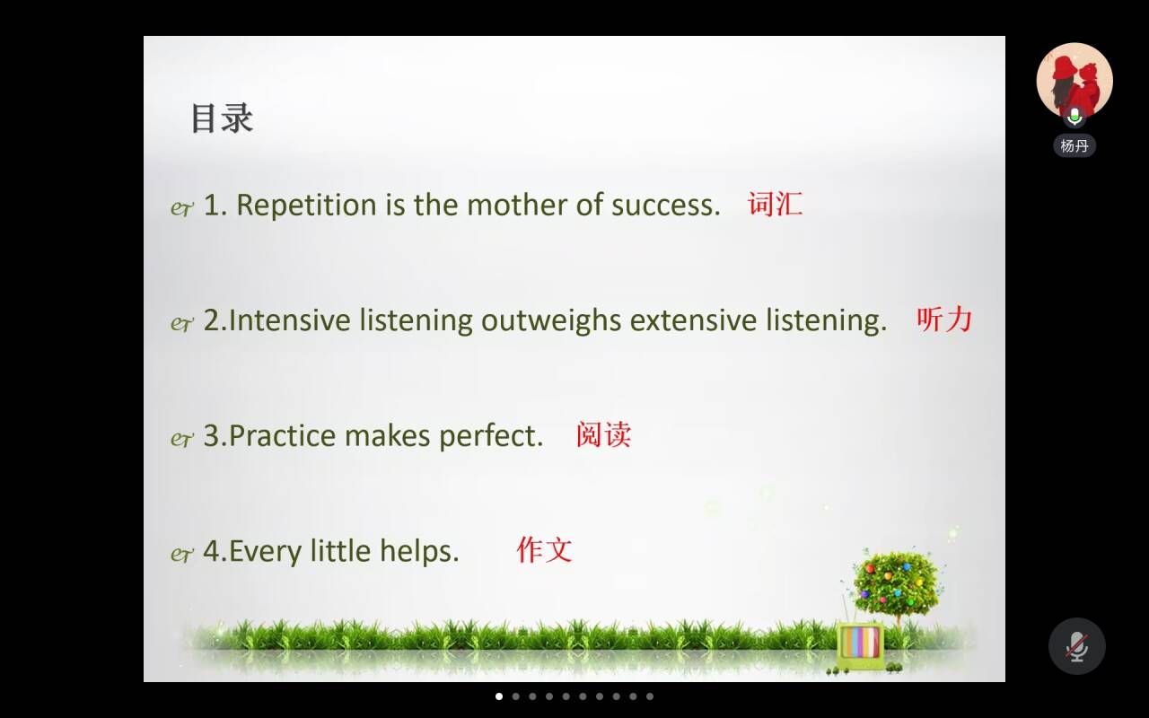 本网讯(文、图/杨洋)近日,pg娱乐电子游戏官网入口邀请外国语学院杨丹老师在线为学院备考英语四六级和考研的同学们作了考研英语和四六级英语学习方法指导。