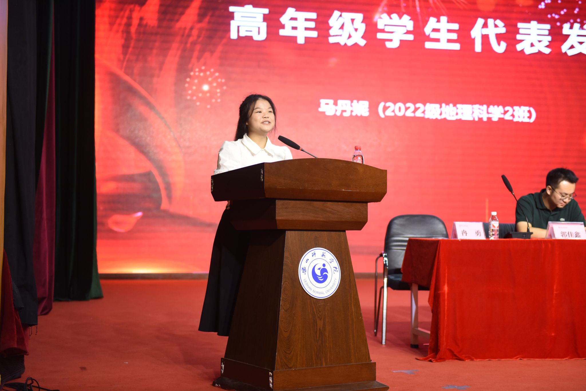 高年级学生代表,国家励志奖学金、邦泰奖学金、第九届“田家炳杯”全国师范院校师范生教学技能竞赛优胜奖获得者、2022级地理科学专业2班马丹妮为新同学们分享了自身成长经验,强调要明确目标,将个人理想融入学院发展,以宽广的胸怀努力实现梦想。她勉励同学们共同努力,不负时代,不负韶华。