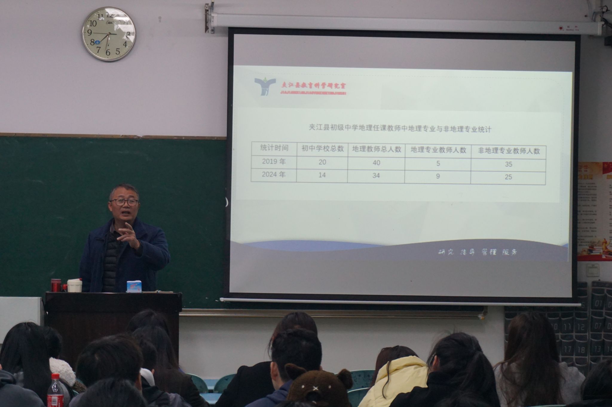 王向斌以夹江县为例,介绍了当地教育的基本情况,包括学校分布、学生数量等,使同学们对其有了基础的认知。随后他聚焦地理教师队伍现状,根据夹江县中学分布图进行分析,让同学们了解到当地中学专业地理教师的需求。王向斌希望同学们注重培养良好的师德师风与沟通能力,努力成长为“四有”好老师。同时,他也希望同学们在以后的学习和教学中通过换位思考不断提升自我,为县域中学地理教师队伍发展贡献力量。
