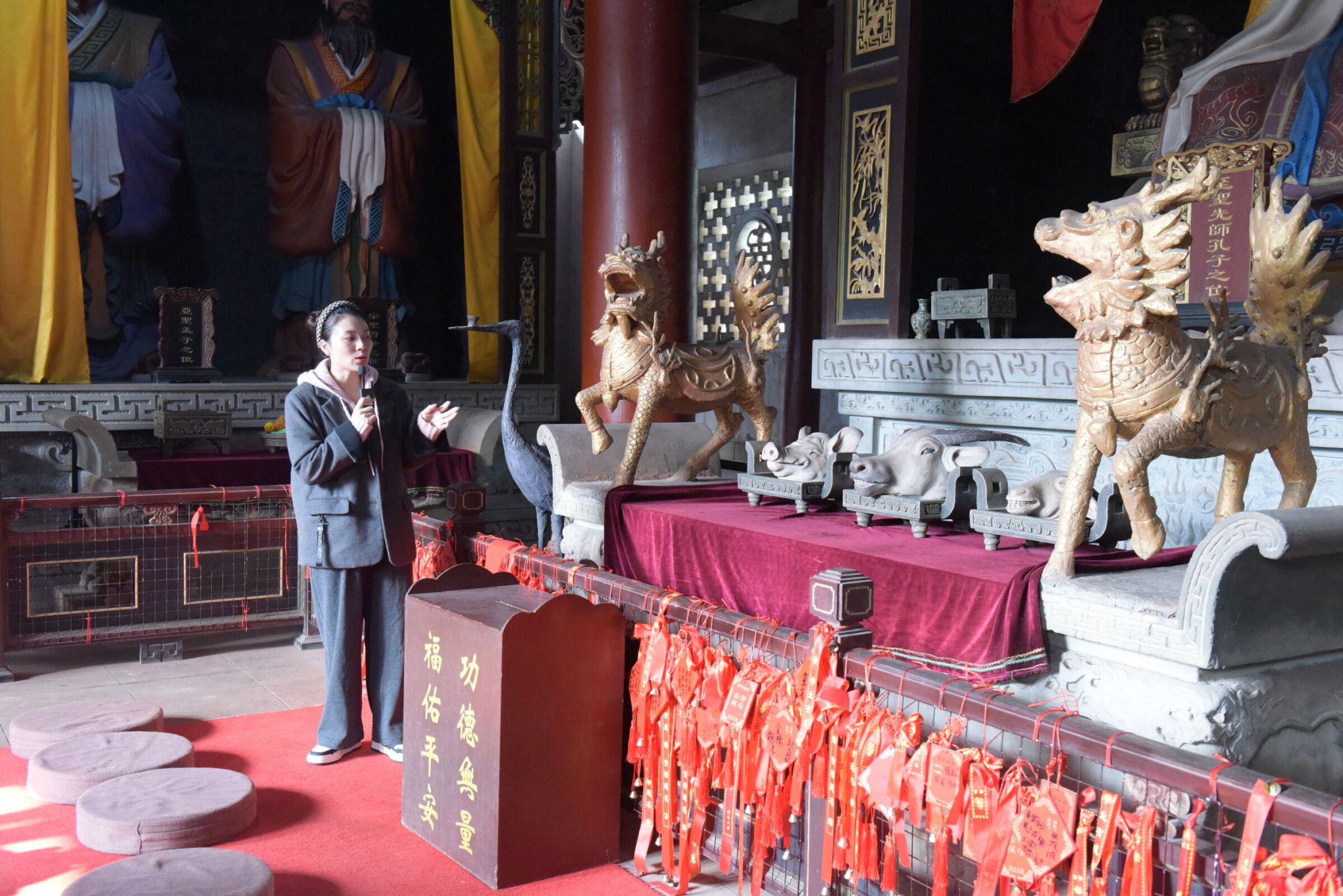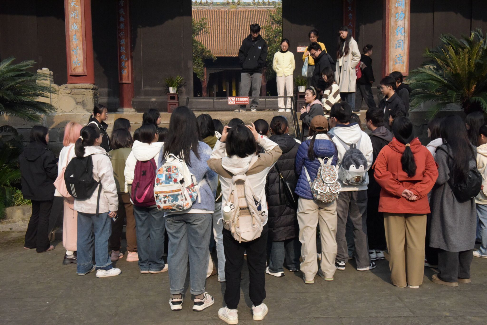 上午,同学们在老师的带领下来到了犍为文庙。在景区讲解员的详细讲解下,同学们依次参观了灵星门、泮池、大成门等标志性建筑。讲解员介绍了大成殿的外观特征、殿内塑像、榫卯抗震结构和柱子材质等。随后,师生们在犍为文庙合影留念后赴罗城古镇考察。吴薇为同学们讲解了罗城古镇与地质环境的相互关系、历史变迁和建筑特色。她介绍了古镇被誉为“东方的诺亚方舟”的独特船型布局,并解释了其形成原因。最后,同学们对古镇的人文风貌、建筑特色、街道走向等进行了自行参观。