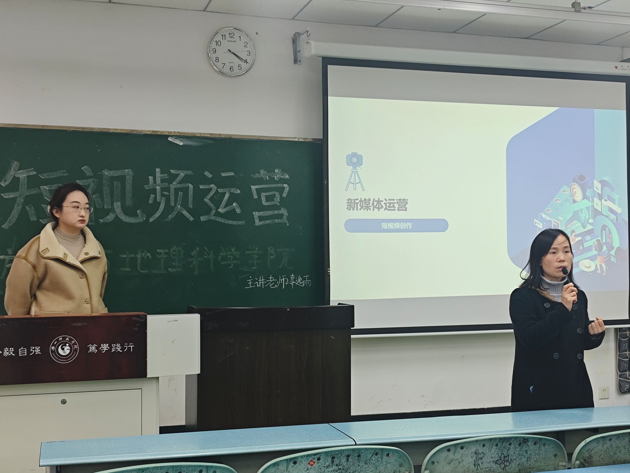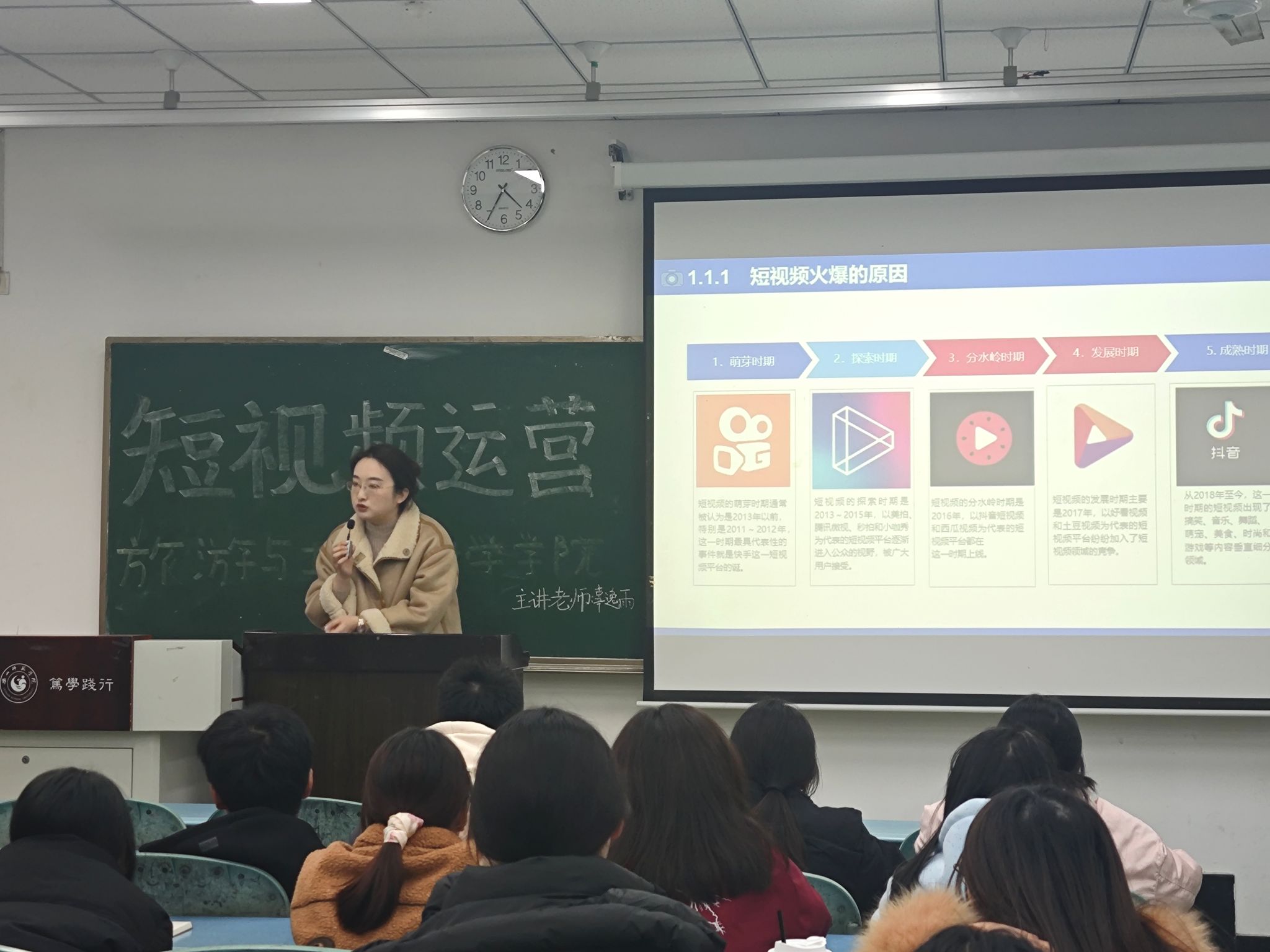 本网讯(文/王小龙、图/杨光)12月5日下午,pg娱乐电子游戏官网入口于行知楼210教室组织开展了主题为“短视频运营”的培训。学院党委书记徐秀云,学生工作办公室主任、分团委书记江纳莅临培训现场。美术与设计学院教师辜逸雨为学院实践特色班和青年传媒中心的同学们做了专题讲座。