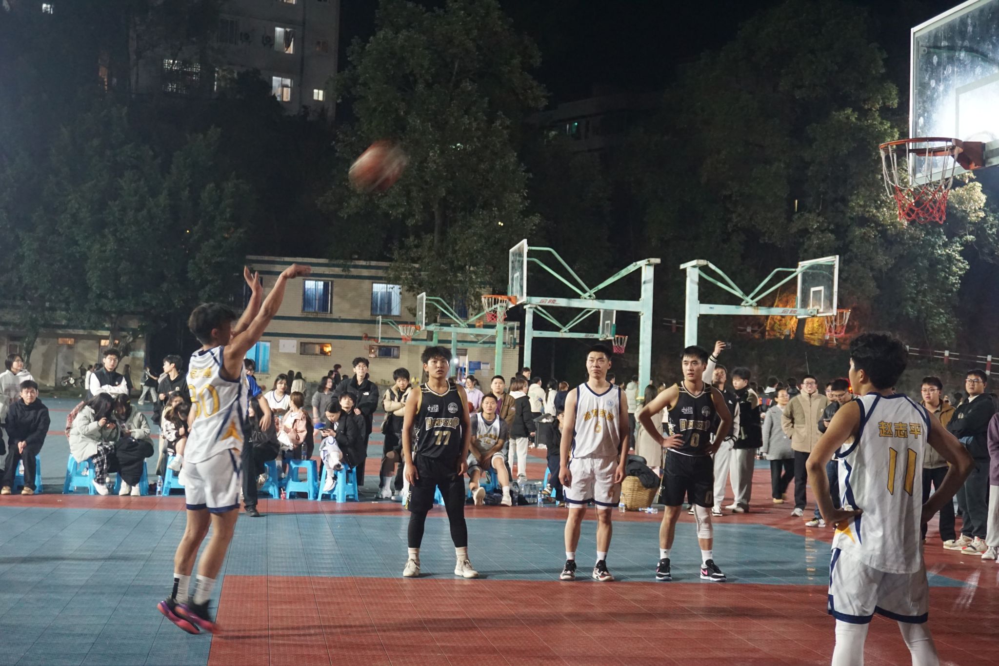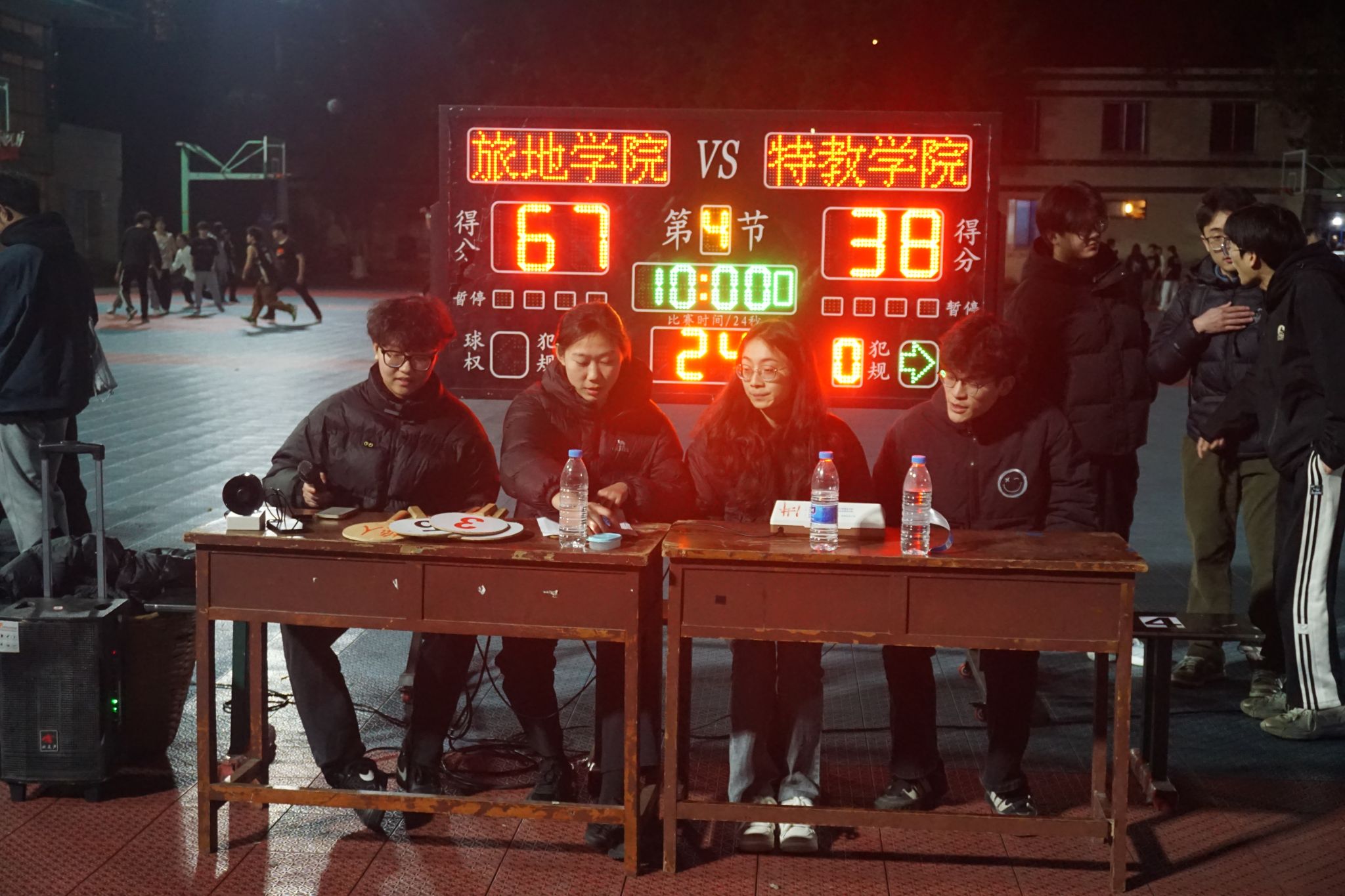 随着裁判哨声划破长空,比赛正式拉开帷幕。旅地学院队员凭借行云流水的传切配合先发制人,开场即建立领先优势;特教学院则展现出顽强韧性,通过灵活的防守反击战术紧咬比分。双方球员的每一次抢断、突破、投篮都牵动着场边观众的心弦,此起彼伏的助威声浪将赛场化作沸腾的青春海洋。