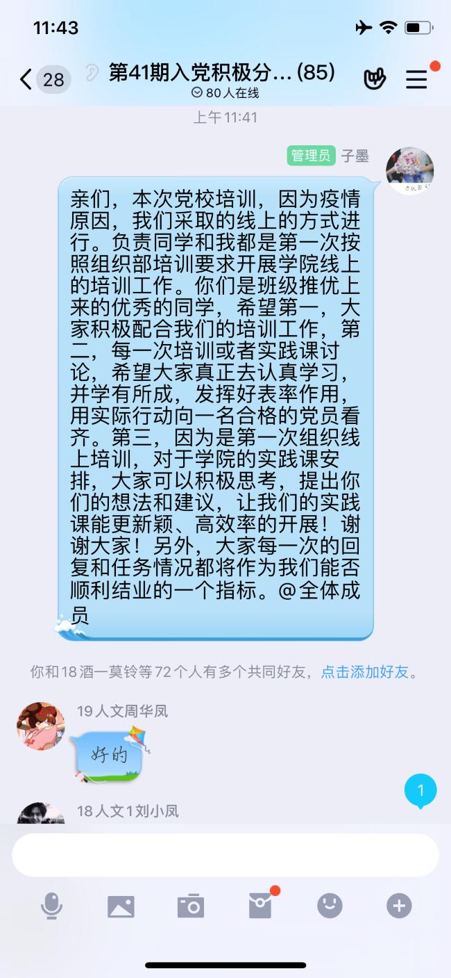 本网讯(文/陈垚 图/韩忠梅)2020年4月18日晚7点,旅游学院分党校第41期入党积极分子第一次实践课在线上开展。本次实践课的内容是观看红色电影《天上的菊美》,旨在从感性材料中让同学们领悟到中国共产党为人民服务的宗旨。同学们通过观看影片发表自己的感受和想法,来相互促进相互进步。同时邀请了17级辅导员谭妙作为本次实际课的答疑老师。在本次实践课开始之前,同学们已经完成了专题一和专题二的理论学习,对中国共产党的起源,党的性质宗旨等有了更全面的了解。在此次实践课中,同学们的感受和看法都比较详细且深入。大部分同学都提到中国共产党员是为人民服务的公仆,要做好表率,即使是在艰苦的条件下也要书写出人生的壮丽篇章。谭妙老师对同学们的看法很赞同,她补充道:一个合格的共产党员并不能仅仅局限于个人如何成长如何做表率,更要学会如何团结身边的人民,尤其是身边的人民群众,加上一个团队的凝聚力往往可以事半功倍。最后,谭妙老师鼓励同学们:作为入党积极分子更应该努力奋斗,在学习和工作中不断充实自己,善于搞团结,为日后成为一名合格的共产党员打下坚实的基础。