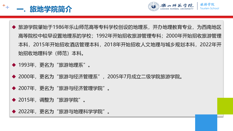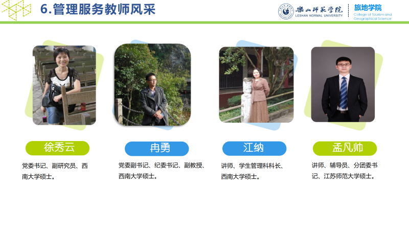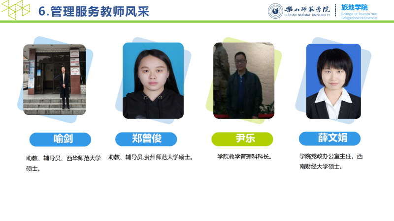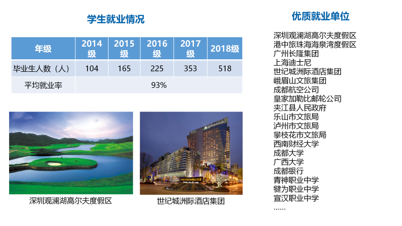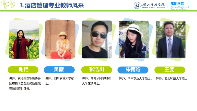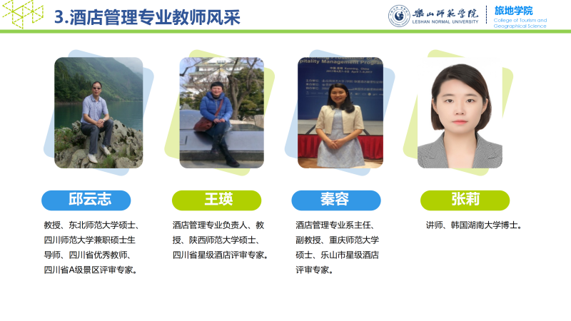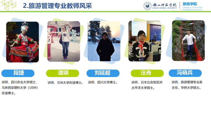 pg娱乐电子游戏官网入口是学校重点建设的特色学院,是教育部和四川省“本科教学工程”地方高校第一批本科专业综合改革试点单位、国家西部旅游专门人才培训示范单位、教育部大学生综合类校外实践教育基地建设单位、支持四川省“十一•五”旅游业发展先进单位、中国旅游协会旅游教育分会先进单位,在全国具有较强影响和较高的知名度。开设有旅游管理、酒店管理、人文地理与城乡规划、地理科学(师范)、旅游管理和酒店管理职高对口等本科专业。现有教职工43人,其中教授7名,副教授10名,博士14名,外籍专家1人、教育部专家1人,四川省优秀教师1人,四川省学术和技术带头人后备人选1人、硕士生导师7人。