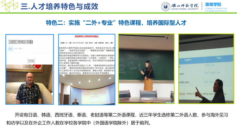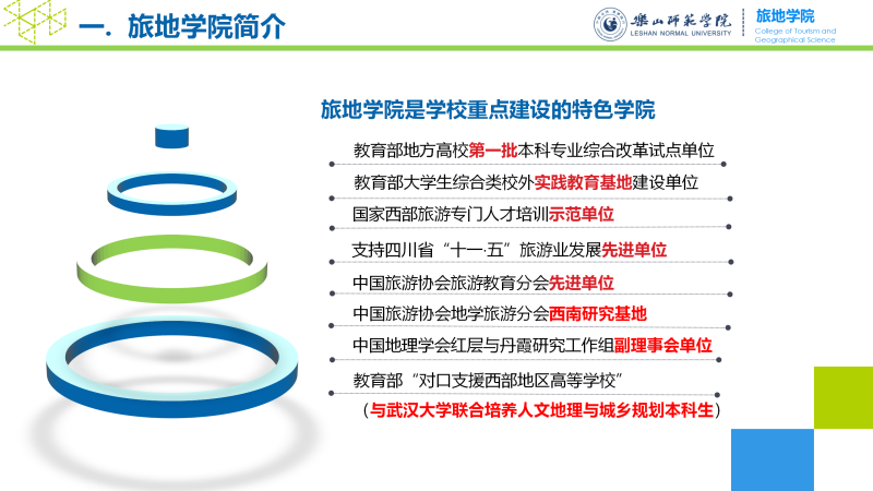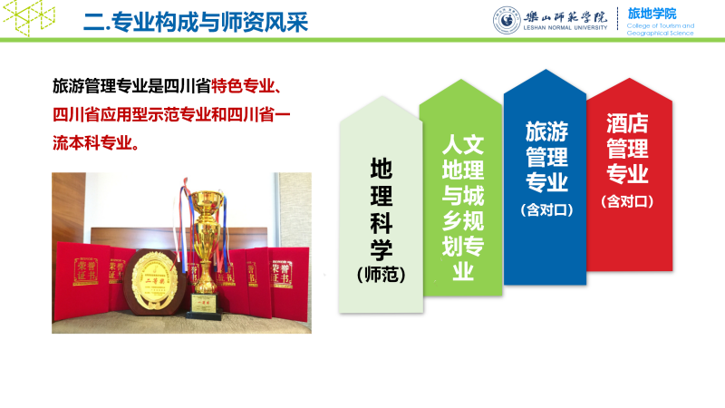 pg娱乐电子游戏官网入口是全国同类地方院校中旅游研究最强的二级学院之一。建有四川省哲学社会科学重点研究基地——四川旅游发展研究中心、原四川省旅游局“遗产旅游研究基地”、 四川省社科联社会科学普及基地——四川世界遗产普及基地、乐山市 “世界遗产研究所”、华中师大(国家文化产业研究中心)西南文化遗产研究基等科研机构。近年来获国家级项目2项、省部级项目30多项,发表论文100余篇,其中核心期刊论文50多篇,出版专著、教材10多部;获得省哲学社会科学优秀成果二等奖1项,优秀成果奖2项。是四川省建设本科旅游管理高等教育质量工程最早和最多的单位,共建设国家教育质量工程2项,省级教育质量工程7项、省级教改项目3项,国家规划教材2部,省规划教材2部,获得省部级以上教学成果奖2项。