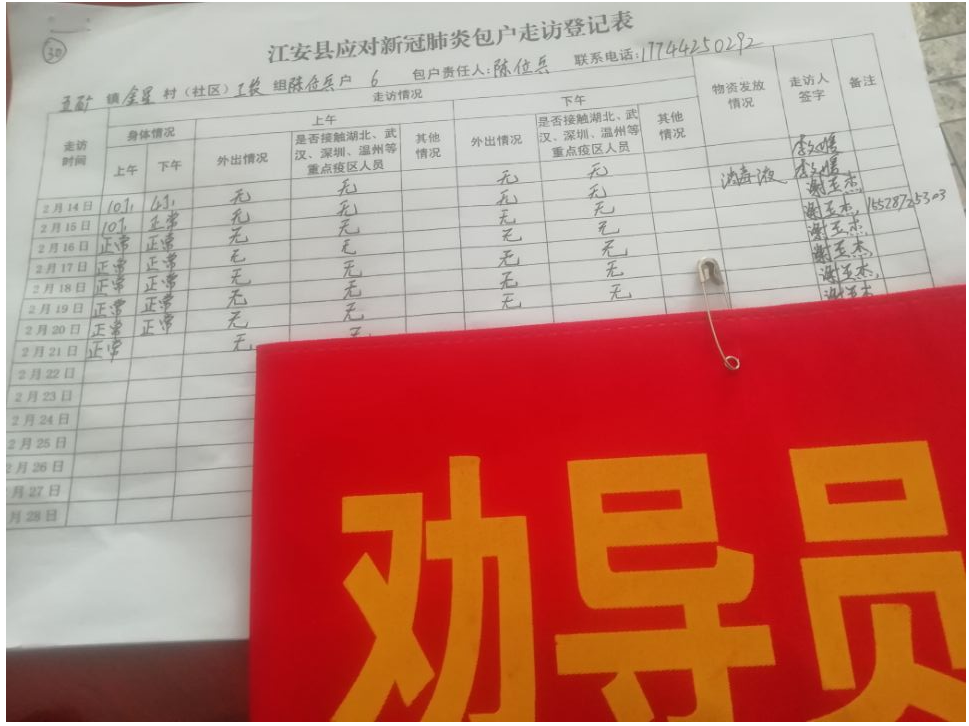 为积极响应国家疫情防控工作,各地区各乡镇须对来往车辆和行人进行出入登记。家住四川省广安市武胜县赛马镇李子坑村的尹佳鑫在假期期间看到了招募大学生志愿者的通知后,毫不犹豫地报了名。他说:“作为当代大学生,我们应当积极响应党和国家的号召。”尹佳鑫作为志愿者主要从事的工作是在设立的卡口处进行信息登记,并且作为村支书的助手,协助办理健康证明和临时出入证件。