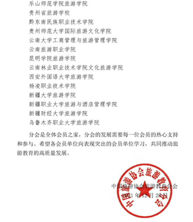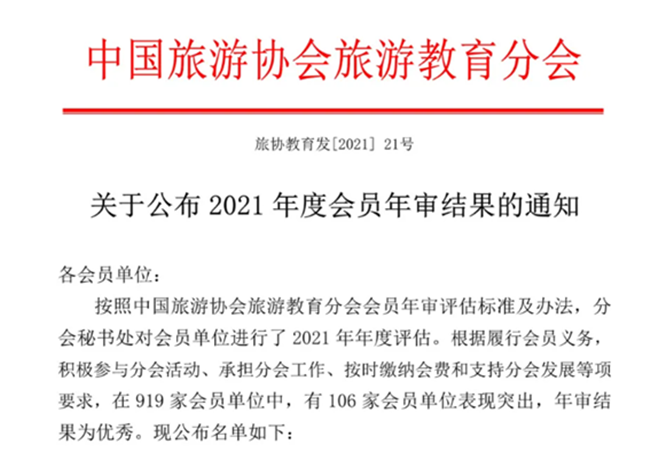 本网讯(图、文/薛文娟)12月28日,按照《中国旅游协会旅游教育分会会员年审评估标准及办法》,中国旅游协会旅游教育分会秘书处对会员单位进行了2021年年度评估。根据履行会员义务、积极参与分会活动、承担分会工作、按时缴纳会费和支持分会发展等要求,在919家会员单位中,有106家会员单位表现突出,年审结果为优秀。乐山师范学院旅游学院荣获2021年度“优秀会员”称号。