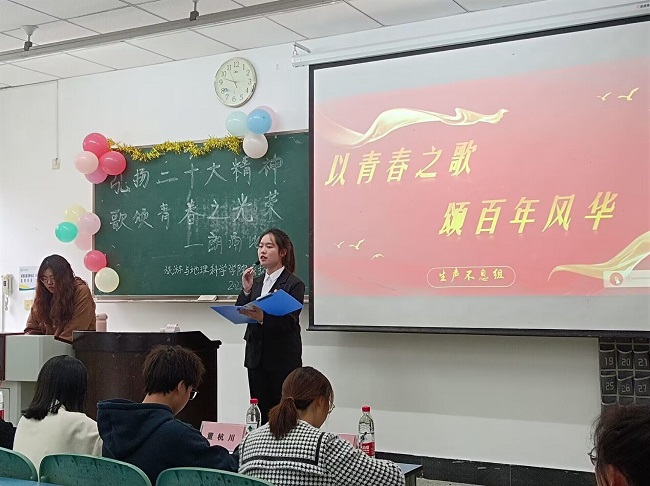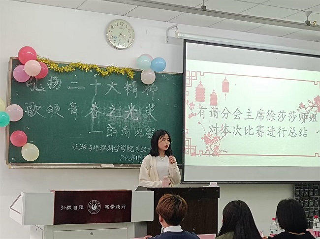 本网讯(文/吉宜洋,图/斯芯素)日月开新元,万象启新篇。为进一步组织旅地学子学习贯彻党的二十大精神,pg娱乐电子游戏官网入口于11月26日下午在行知楼108教室组织开展了以“学习党的二十大精神,谱写壮丽青春之歌”为主题的朗诵比赛。比赛由李佳嵘同学主持,担任比赛评委的是学生分会主席徐莎莎,传媒中心易班技术部部长苏椿翔以及分团委各部部长。
