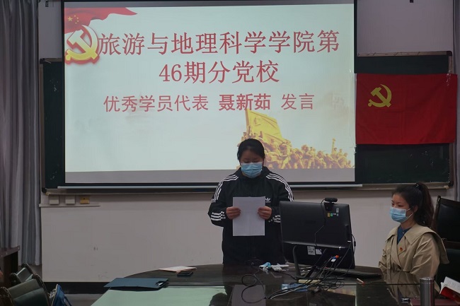 典礼在庄严的国歌声中拉开帷幕。本次党校培训中,有两名表现优异、成绩突出的同学脱颖而出,孟凡帅为她们颁奖。随后优秀学员代表聂新茹同学作了交流发言。