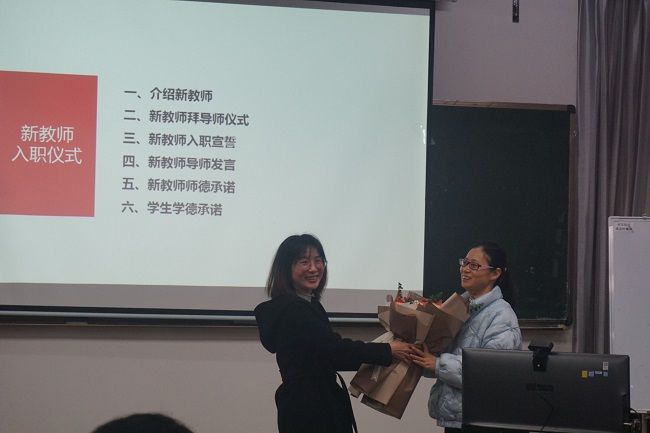 拜师仪式上,高嘉宁、朱冉、万利平三位新教师分别为自己的导师献上鲜花,感谢导师对自己的工作和成长予以精心指导。之后新教师发言,表达了自己对教育的热爱、向导师学习的决心和对导师的感恩之心。大家表示今后将本着虚心求教的态度,认真向导师学习请教,主动钻研提升,不辜负导师的期望和厚爱,不辜负学院的要求和培养,为学院的建设和发展贡献力量。