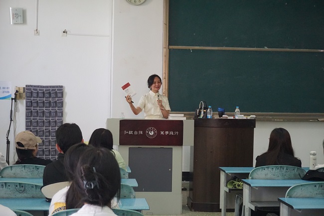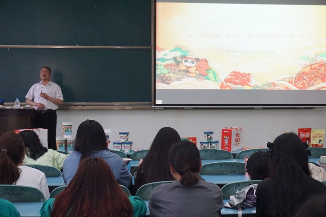 祝志高介绍了乐山悠久的美食文化,全方位为同学们讲解了淄博烧烤文化及其特点,并将其与乐山久负盛名的钵钵鸡联系起来,宣传了乐山美食文化。讲座现场,同学们品鉴了钵钵鸡,美食的香味使同学们流连忘返,现场气氛活跃。刘敏分享了她的人生经历,展示了有颜有味集团一步一步成长起来的历程,介绍了集团为传播乐山美食文化作出的努力。