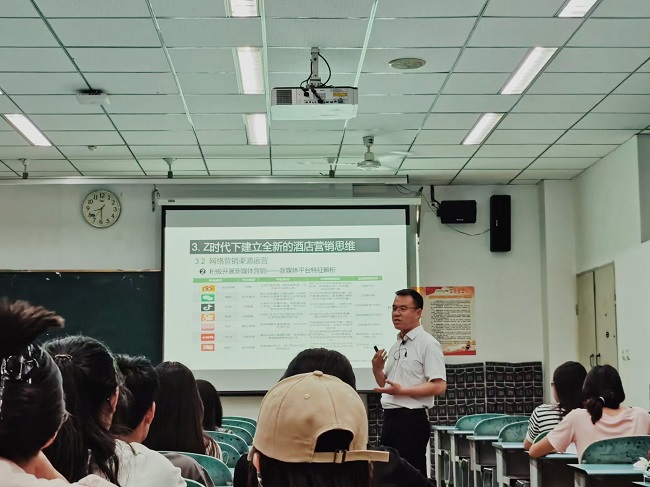 本网讯(文、图/王瑛)5月17日,由pg娱乐电子游戏官网入口主办的实践周专家讲座在行知楼311教室顺利举行。酒店管理专业负责人王瑛教授主持讲座。pg娱乐电子游戏官网入口外聘专家、乐山禅驿酒店总经理樊欣为22级酒店管理专业全体同学、旅游管理专业部分同学做了题为“Z时代下酒店营销思维变革”讲座。