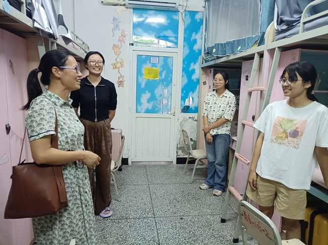 在走访过程中,学院领导和老师们与新同学们亲切交谈。徐秀云勉励同学们要养成良好的生活、学习习惯,积极进取,夯实专业基础,提升综合素质,做好未来职业规划,为实现人生梦想筑牢根基。郭剑英希望同学们珍惜缘分,相互团结,互相包容,营造良好的学习和文化氛围。冉勇勉励同学们要尽快完成角色转换,适应新环境、融入新集体,珍惜大学四年青春时光,心无旁骛求知问学,立志肩负起新时代新青年的历史使命和时代责任。孙永兴亲切地询问同学们是否习惯新的学习环境,并了解学生对未来的职业目标定位,勉励同学们确定未来发展方向、学好专业知识,希望同学们以全新的面貌拥抱大学生活,学有所成、学有所获。