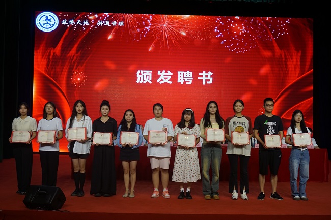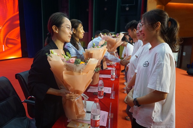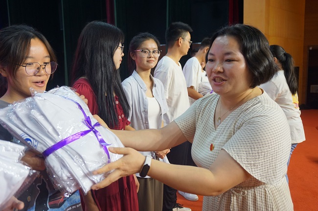最后,2023级辅导员江纳和班主任段捷为新生代表赠送学校校服,希望同学们能够秉承“敢为人先,臻于至善”的乐师精神,坚守“弘毅自强,笃学践行”的乐师校训,铭记“旅博天地,游通世理”的院训,做一个合格的乐师人、旅地人。
