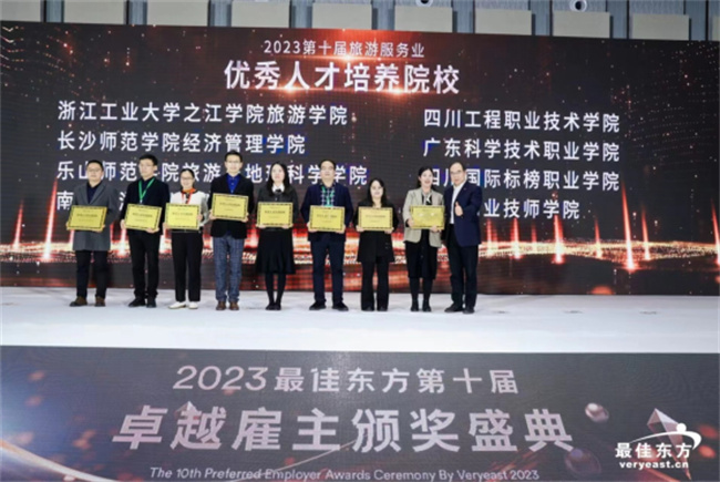 在颁奖盛典上,最佳东方评出旅游服务业2023第十届卓越雇主、杰出总经理、木兰奖、优秀人才培养院校、产教融合先锋奖等。pg娱乐电子游戏官网入口荣获最佳东方“2023第十届旅游服务业优秀人才培养院校”称号。