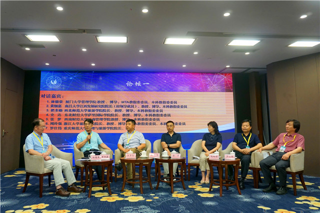 研讨会论坛一的主题为“新时代旅游学科建设与乡村振兴”,由厦门大学管理学院林德荣教授主持。南昌大学江西发展研究院院长黄细嘉教授、西北师范大学旅游学院院长把多勋教授、东北财经大学萨里国际学院院长史达教授、西南财经大学工商管理学院张梦教授、浙江大学旅游学院院长周玲强教授、重庆师范大学地理与旅游学院院长罗仕伟教授应邀作嘉宾对话。黄细嘉教授认为“乡村振兴是有情怀的工作,我们要做一个有情怀的人,为乡村设计生产、生活和生态。”把多勋教授强调“要把乡村振兴国家战略深度融合到旅游学科建设中,为旅游学科提质增效、转型升级赋能。”史达教授强调“我们要做好旅游学科的工作,讲好乡村振兴的故事。”张梦教授强调“乡村振兴将为学科建设的中国学派、中国特色做出贡献。”周玲强教授认为“数字乡村永远在路上。”罗仕伟教授强调“旅游学科应该培养更加优秀的旅游人才,促进乡村振兴快速发展。”