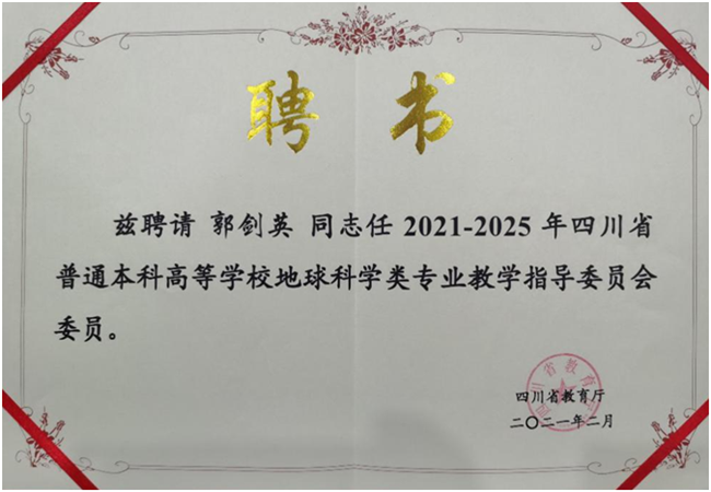 开幕式上,四川省教育厅高教处副处长罗亦凡在致辞中对四川省普通本科高校仪器及力学类、地球科学类专业教学指导委员会的成立表示热烈祝贺,他表示两个教指委带领省内相关高校坚持以习近平新时代中国特色社会主义思想为指引,牢记“为党育人、为国育才”的神圣使命,全面落实立德树人根本任务,着力提升相关专业的建设水平,不断提升人才培养质量,为加快建设我省高质量高等教育体系、服务省委建设教育强省战略部署,提供有力的支撑和保障。罗亦凡为本届四川省仪器及力学类、地球科学类专业教指委到场的主任委员、副主任委员及委员们颁发聘书,旅游学院院长郭剑英入选四川省地球科学类专业教学指导委员会委员。