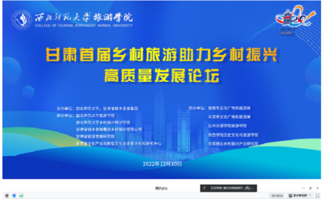 本网讯(图、文/孙永兴)12月10日,由西北师范大学与甘肃省城乡发展集团联合主办的甘肃省首届“乡村旅游助力乡村振兴高质量发展论坛”在西北师范大学举行。本次论坛采用线上会议与同步直播方式进行,以“乡村旅游助力乡村振兴高质量发展”为主题,旨在为深入贯彻党的二十大报告提出的“全面推进乡村振兴,畅通城乡要素流动”的重要精神,全面落实《中华人民共和国乡村振兴促进法》《甘肃省乡村振兴促进条例》等文件精神,破解当前乡村振兴诸多问题,激发乡村文旅融合内生动力,全面推进甘肃省乡村振兴事业发展。pg娱乐电子游戏官网入口郭剑英教授、郑元同教授等参加了在线会议。