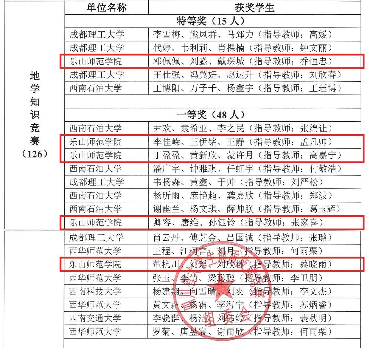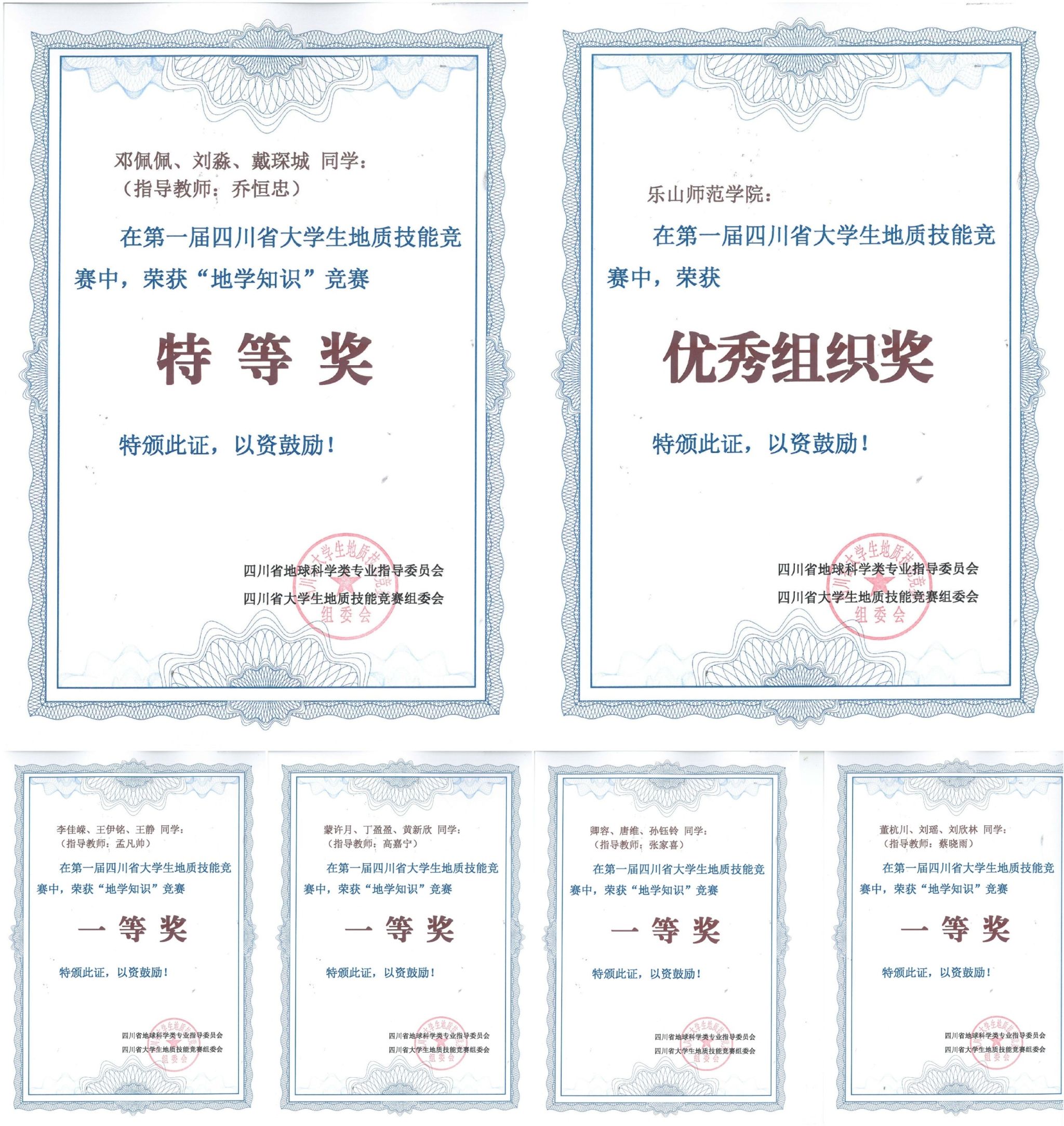 本次四川省大学生地质技能竞赛经过激烈角逐,pg娱乐邓佩佩、刘淼和戴琛城3位同学获得“地学知识竞赛”特等奖,李佳嵘等12位同学获得“地学知识竞赛”一等奖;乔恒忠、孟凡帅、高嘉宁、张家喜和蔡晓雨等5位老师获得优秀指导教师奖,pg娱乐获得优秀组织奖。在与全省相关高校的激烈竞争中,pg娱乐学子不负众望,以出色的表现为学校争得了荣耀,既展现了pg娱乐学生扎实的地学功底,也体现出pg娱乐电子游戏官网入口深厚的地学教育实力。