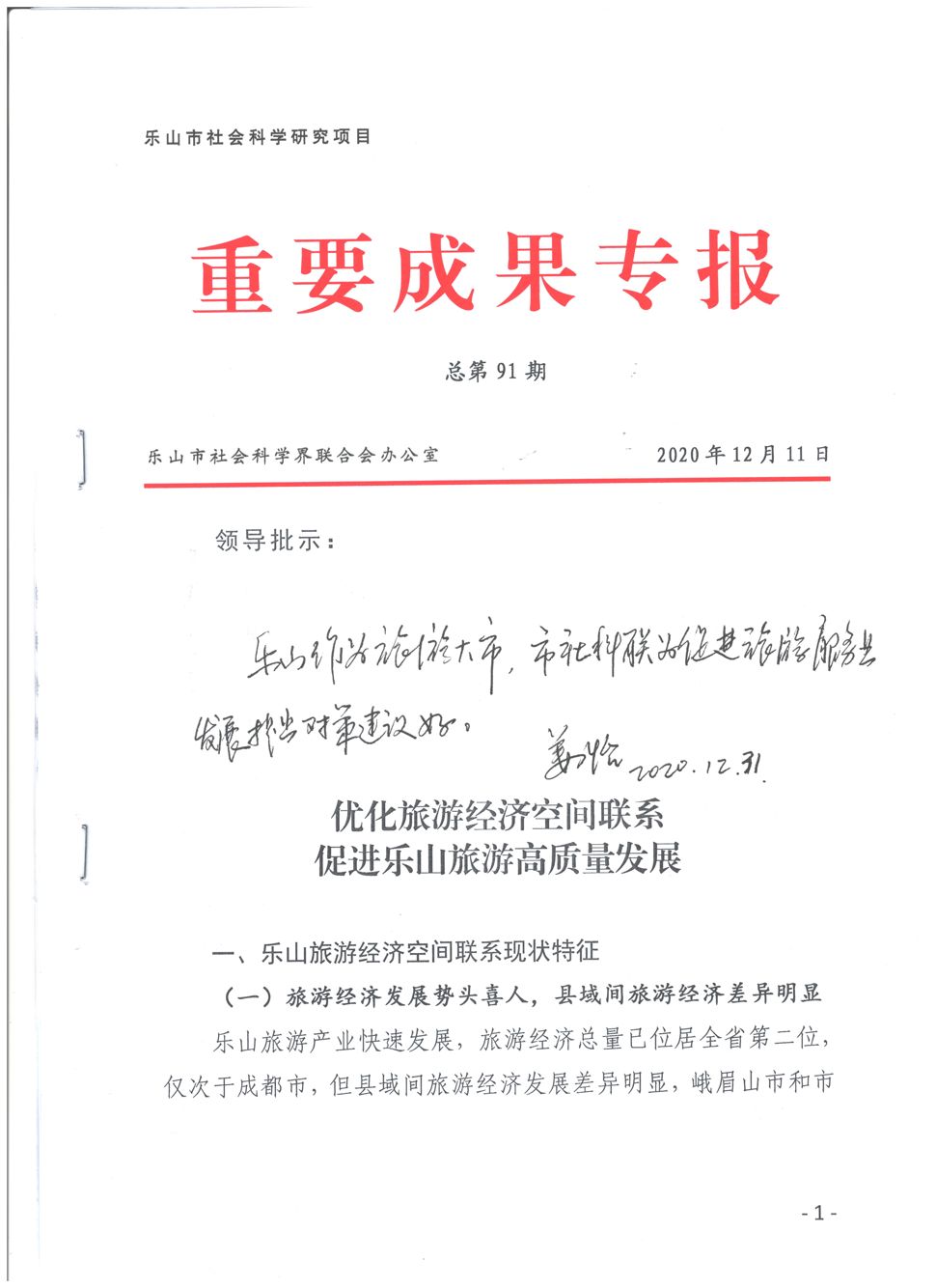 pg娱乐教师冯晓兵撰写报送的《优化旅游经济空间联系 促进乐山旅游高质量发展》在乐山市社会科学界联合办公室主办的重要成果专报第91期刊出,得到四川省社会科学界联合会党组书记姜怡批示“乐山作为旅游大市,市社科联为促进旅游服务业发展提出对策建议好”。
