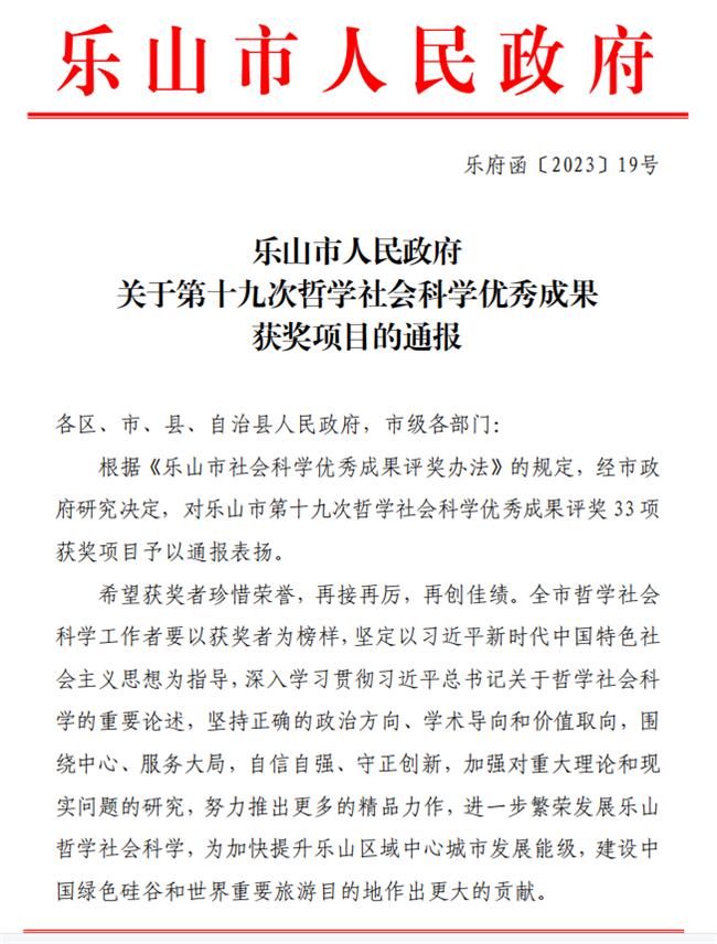 本网讯(图、文/薛文娟)近日,乐山市人民政府公布了乐山市第十九次哲学社会科学优秀成果获奖项目名单。其中,pg娱乐冯晓兵副教授题为《优化旅游经济空间联系 促进乐山旅游高质量发展》的系列论文荣获一等奖。