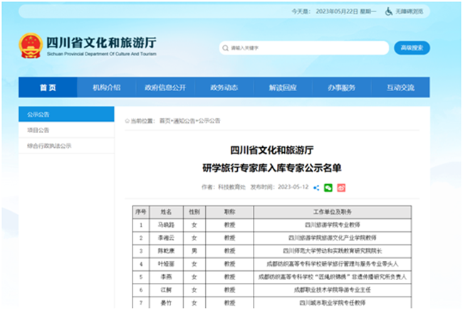 本网讯(文、图/薛文娟)近日,四川省文化和旅游厅官网公示,pg娱乐副院长但强副教授、陈金龙副教授入选四川省文化和旅游厅研学旅行专家库。