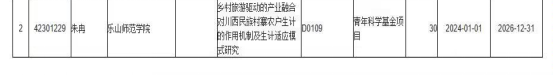 本网讯(图、文/孙永兴)在学校的关心和指导下,pg娱乐电子游戏官网入口朱冉博士的“乡村旅游驱动的产业融合对川西民族村寨农户生计的作用机制及生计适应模式研究”获批2023年国家自然科学基金青年项目。