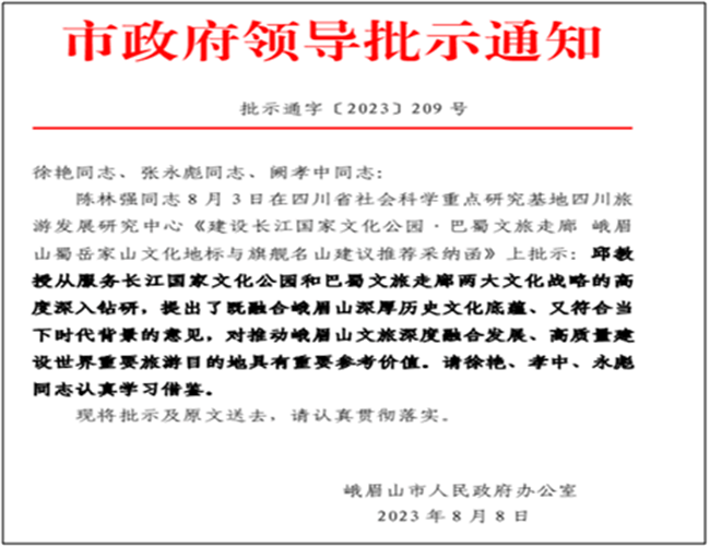 本网讯(图、文/钟晓岚)由四川旅游发展研究中心推荐的pg娱乐pg娱乐电子游戏官网入口邱云志教授撰写的“建设长江国家文化公园•巴蜀文旅走廊峨眉山蜀岳家山文化地标与旗舰名山建议”,于2023年8月3日经峨眉山市人民政府市长陈林强同志签署如下意见:“邱教授从服务长江国家文化公园和巴蜀文旅走廊两大文化战略的高度深入钻研,提出了既融合峨眉山深厚历史文化底蕴、又符合当下时代背景的意见,对推动峨眉山文旅深度融合发展、高质量建设世界重要旅游目的地具有重要参考价值。”峨眉山市人民政府办公室8月8日以“市政府领导批示通知(批示通字〔2023〕209号)”名义将陈市长的签批意见转发峨眉山市委、市政府和峨眉山景区管委会相关领导,要求予以借鉴和贯彻落实。