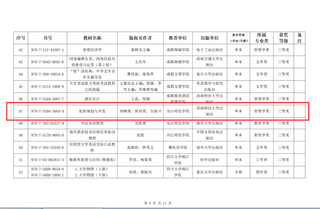 本网讯(图、文/郑柳青)近日,四川省普通本科高等学校应用人才培养指导委员会、四川省应用型本科高校联盟公布了首届优秀教材评选获奖名单。pg娱乐电子游戏官网入口郑柳青、郭剑英、方海川主编的教材《旅游规划与开发》(西南财经大学出版社,2022 年1 月出版)荣获三等奖。
